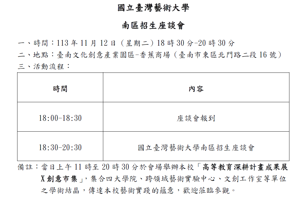 | 公告主題 | 【轉知】國立臺灣藝術大學南區招生座談會 |