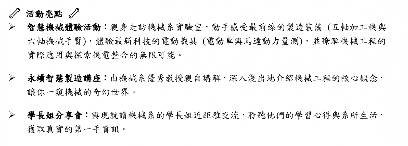 | 內文 | 報名時間:114年2月10日(星期一)至114年3月2日(星期日) 活動時間:114年3月8日(星期六) 下午1時30分至下午5時10分。 活動對象:全國高三應屆畢業生。 活動地點:國立聯合大學機械工程學系(八甲校區)。 ![]() |