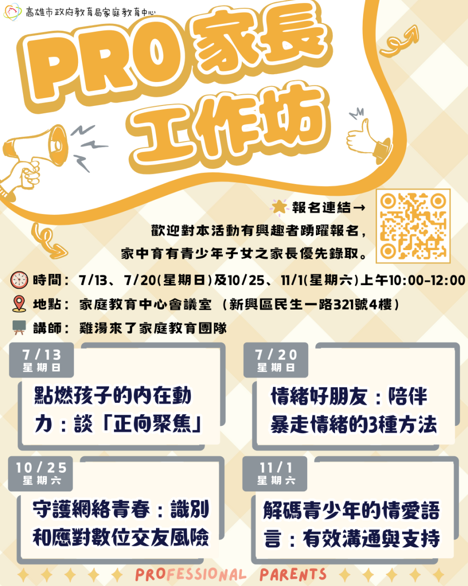 | 內文 | (一)辦理時間、主題: 1、114年7月13日(星期日)上午10時至12時:「點燃孩子的內在動力:談『正向聚焦』」 2、114年7月20日(星期日)上午10時至12時:「情緒好朋友:陪伴暴走情緒的3種方法」 3、114年10月25日(星期六)上午10時至12時:「守護網絡青春:識別和應對數位交友風險」 4、114年11月1日(星期六)上午10時至12時:「解碼青少年的情愛語言:有效溝通與支持」 (二)辦理地點:本中心會議室(新興區民生一路321號4樓) (三)講師:雞湯來了家庭教育團隊 ![]() |