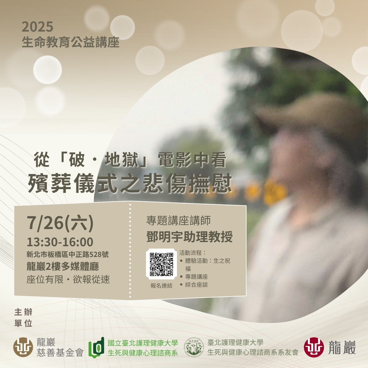| 公告主題 | 國立臺北護理健康大學-生死與健康心理諮商系「從『破.地獄』電影中看殯葬儀式之悲傷撫慰」公益講座活動 |