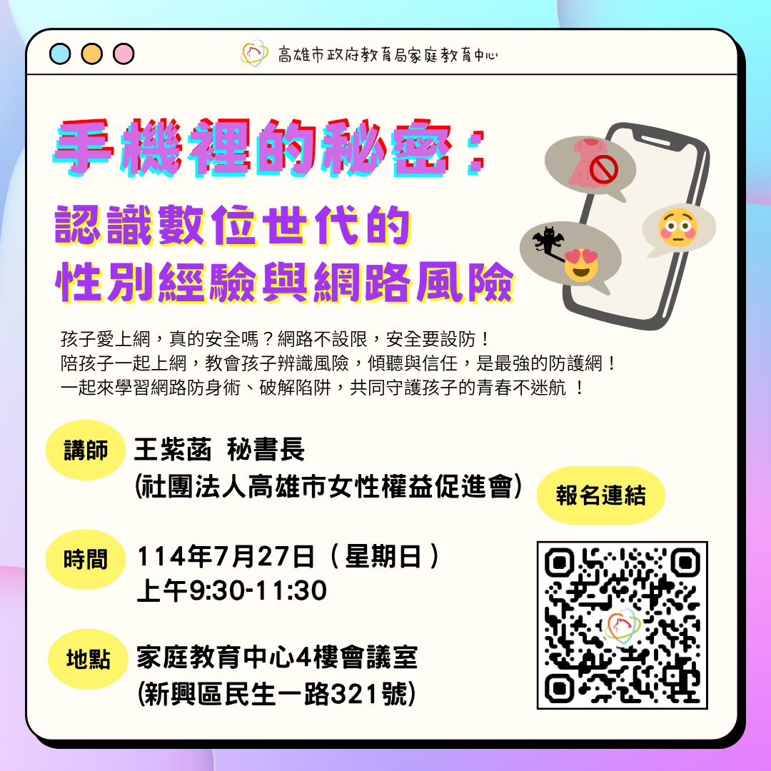 | 公告主題 | 家庭教育中心-「手機裡的秘密:認識數位世代的性別經驗與網路風險」講座 |