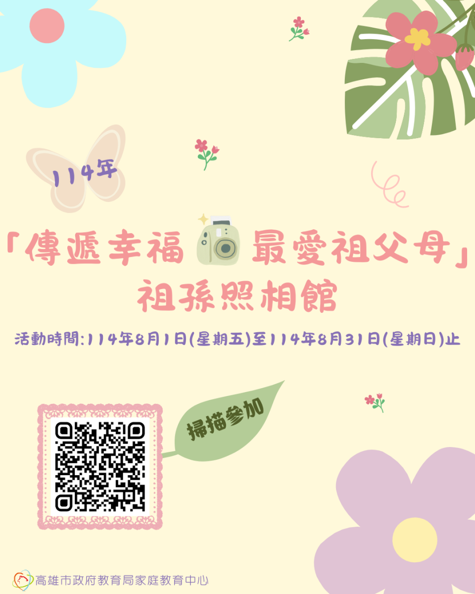| 內文 | 活動時間:即日起至114年8月31日(星期日)止。 參加對象:限高雄市民(對本活動有興趣的祖孫、家庭) 活動內容如下: (一)祖父母節「祖孫情深深」線上活動: 1、網站連結:https://reurl.cc/xNmlnZ 2、活動內容:線上問答。 3、獎勵方式:答對10題以上,於活動結束後抽出100名得獎者,可獲得500元全聯商品禮券。 (二)「傳遞幸福.最愛祖父母」祖孫照相館(需登入Google帳號): 網站連結:https://reurl.cc/eM2Dx7 2、活動內容:募集全市祖孫「共讀、共學、共玩」活動合影相片。 3、獎勵方式: (1)上傳分享相片即抽50名幸運得主(需符合參與活動資格及作品規格),獲得200元7-11商品禮券。 (2)募集結束後,將挑選「最佳互動」20張相片,並將相片製作線上「祖孫照相館小短片」至中心臉書粉絲專頁傳遞幸福溫馨祖孫情,並另贈500元全聯商品禮券予以鼓勵。 ![]() ![]() |