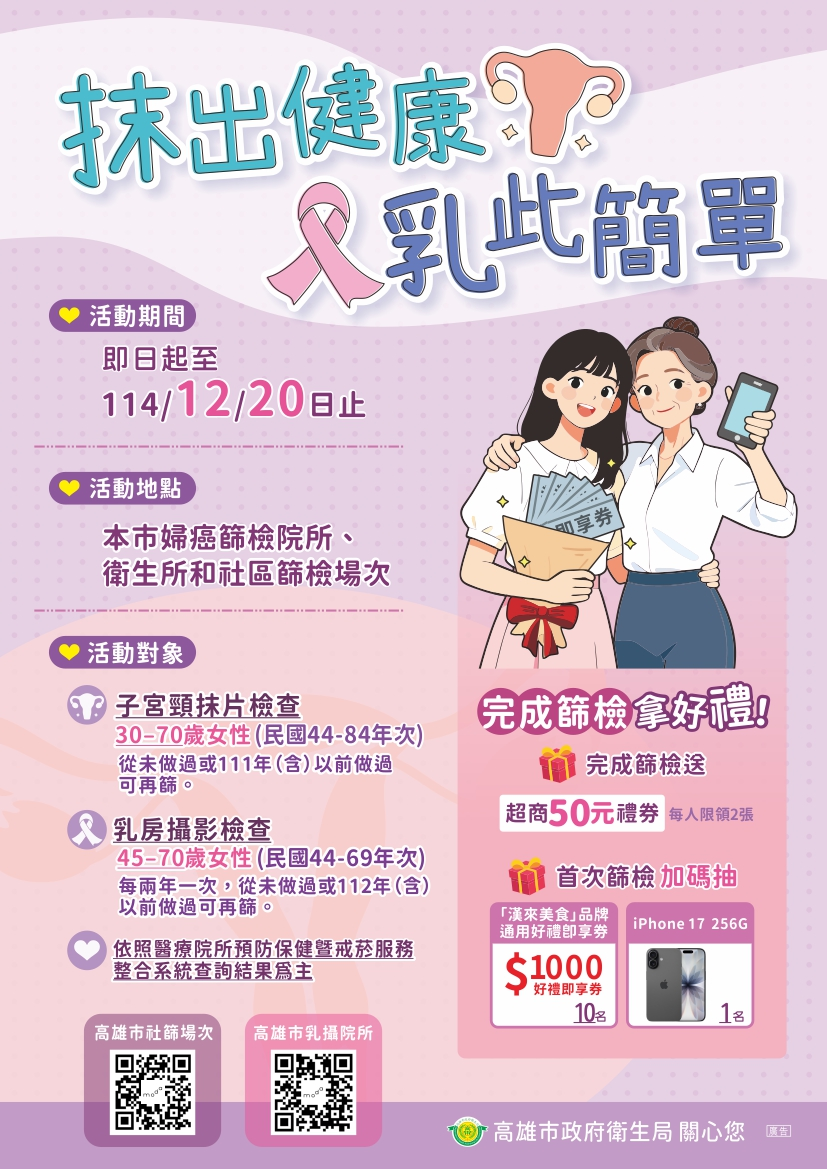 | 內文 | 主旨:本局辦理「抹出健康 乳此簡單」篩檢活動,檢送篩檢活動文宣電子檔乙份,敬請協助公告宣傳,並鼓勵貴單位同仁及宣導符合資格民眾踴躍受檢,請查照。 說明: 一、本局為傳達「掌握健康其實很簡單」的理念,呼籲女性只要花六分鐘完成子宮頸抹片檢查,並定期進行乳房攝影,即能輕鬆守護自身健康,辦理旨揭篩檢活動,內容如下: (一)活動日期:114年11月20日至114年12月20日。 (二)活動對象: 1、設籍或居住於高雄市女性市民。 2、子宮頸抹片:30-70歲從未做過或3年內未接受抹片者(最近一次抹片日為111年以前)。 3、乳房X光攝影篩檢:符合45-70歲定期篩檢資格者。 (三)活動地點: 1、本市38區衛生所辦理社區篩檢場次(https://gov.tw/Tc8)。 2、本市參與醫療院所(https://gov.tw/SRo)。 (四)活動獎勵: 1、符合條件並完成篩檢,即贈超商禮券50元/項(每人限領2張)。 2、首次篩檢者限定抽獎,獎項為漢來美食品牌通用電子即享券1,000元(無效期)×10名、Apple iPhone 17(256G) × 1名。 二、檢附本案活動宣傳單張乙份,詳細資訊可至「高雄市政府癌症篩檢便利網」查詢,網址:https://gov.tw/t27 ![]() |